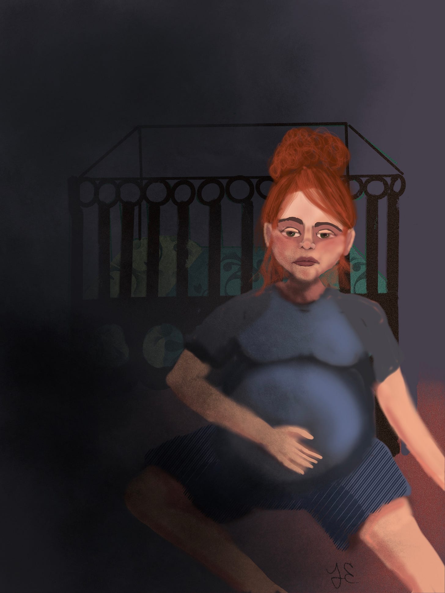 Jacob found Hannah in the nursery. She was sitting on the ground, leaning her head against the crib and crying. Her belly overpowered everything about her. She was sitting cross legged, and Jacob could barely see her legs. She saw him enter and wiped angrily at her tears.